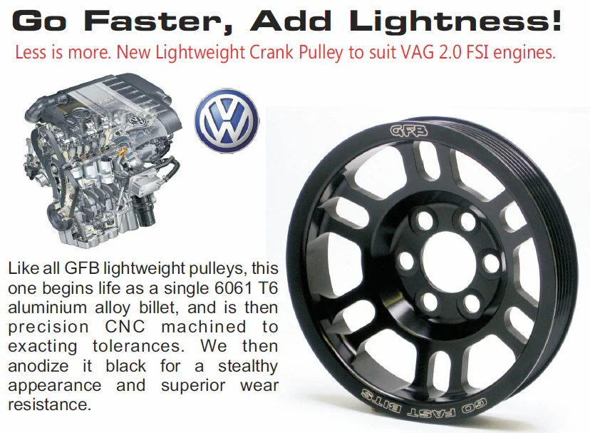 De GFB Light Crank Pulley is een lichtgewicht krukaspoulie, gemaakt van een enkel stuk 6061 T6 aluminiumlegering en nauwkeurig CNC-gefreesd voor optimale prestaties. Deze pully is geanodiseerd in zwart voor een subtiele, stealthy look en verhoogde slijtvastheid. Met een gewichtsbesparing van 1,4 kg ten opzichte van de fabrieksversie, biedt deze krukaspoelie scherpere gasrespons en een verbeterde acceleratie, zonder in te leveren op sterkte of betrouwbaarheid.